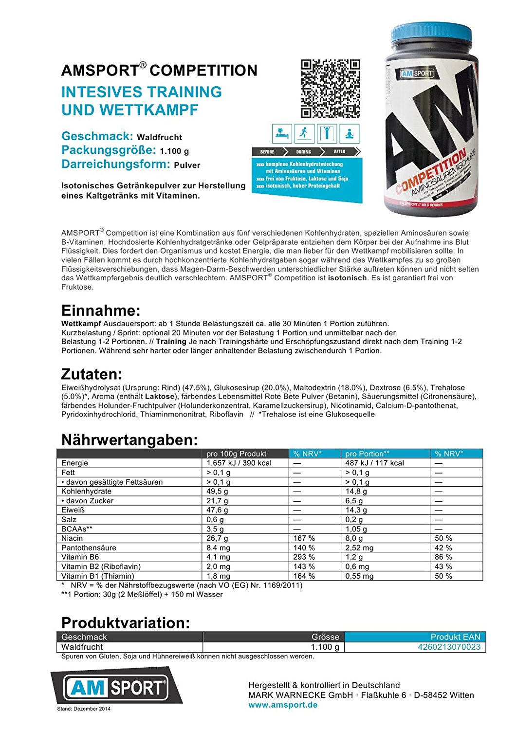 AMSPORT Competition ist eine hocheffiziente Kombination aus fünf verschiedenen Kohlenhydraten, speziellen Aminosäuren und der für den Proteinstoffwechsel und die Leistungsentwicklung wichtigsten B-Vitaminen. Über das Zusammenspiel vom körpereigenen Hormon Insulin und den hochwertigen Energieträgern, wird gerade direkt nach einer körperlichen Belastung das natürliche anabole Potential maximal unterstützt und den Zellen schnellstmöglich Energie zugeführt. Durch den Zusatz von hochwertigen Vitamin-B-Komplexen unterstützt AMSPORT Competition die aufbauenden Effekte im Organismus und den Aminosäurestoffwechsel. Hochdosierte Kohlenhydratgetränke oder Gelpackungen entziehen dem Körper bei der Aufnahme ins Blut Flüssigkeit, da die Kohlenhydratkonzentration sehr hoch ist. Dies fordert den Organismus und kostet Energie, die man lieber für den Wettkampf mobilisieren sollte. In vielen Fällen kommt es durch hochkonzentrierte Kohlenhydratgaben sogar während des Wettkampfes zu so großen Flüssigkeitsverschiebungen, dass Magen-Darm-Beschwerden unterschiedlichster Stärke auftreten können und nicht selten das Wettkampfergebnis deutlich verschlechtern. Um Magen-Darm-Problemen aus dem Weg zu gehen und gleichzeitig eine noch effektivere und schnellere Nährstoffanflutung im Organismus zu erreichen, ist AMSPORT Competition isotonisch errechnet. Das noch relativ unbekannte Kohlenhydrat Trehalose in AMSPORT Competition ist zum Einen eine hochwertige Energiequelle, zum Anderen ein medizinisch hochinteressanter Zucker. Trehalose hat Zellmembran stabilisierende Eigenschaften und schützt Zellen vor Dehydration und thermischen Stress. AMSPORT Competition liefert im Training sowie Wettkampf schnell und zuverlässig Energie aus dem speziellen Kohlenhydratm