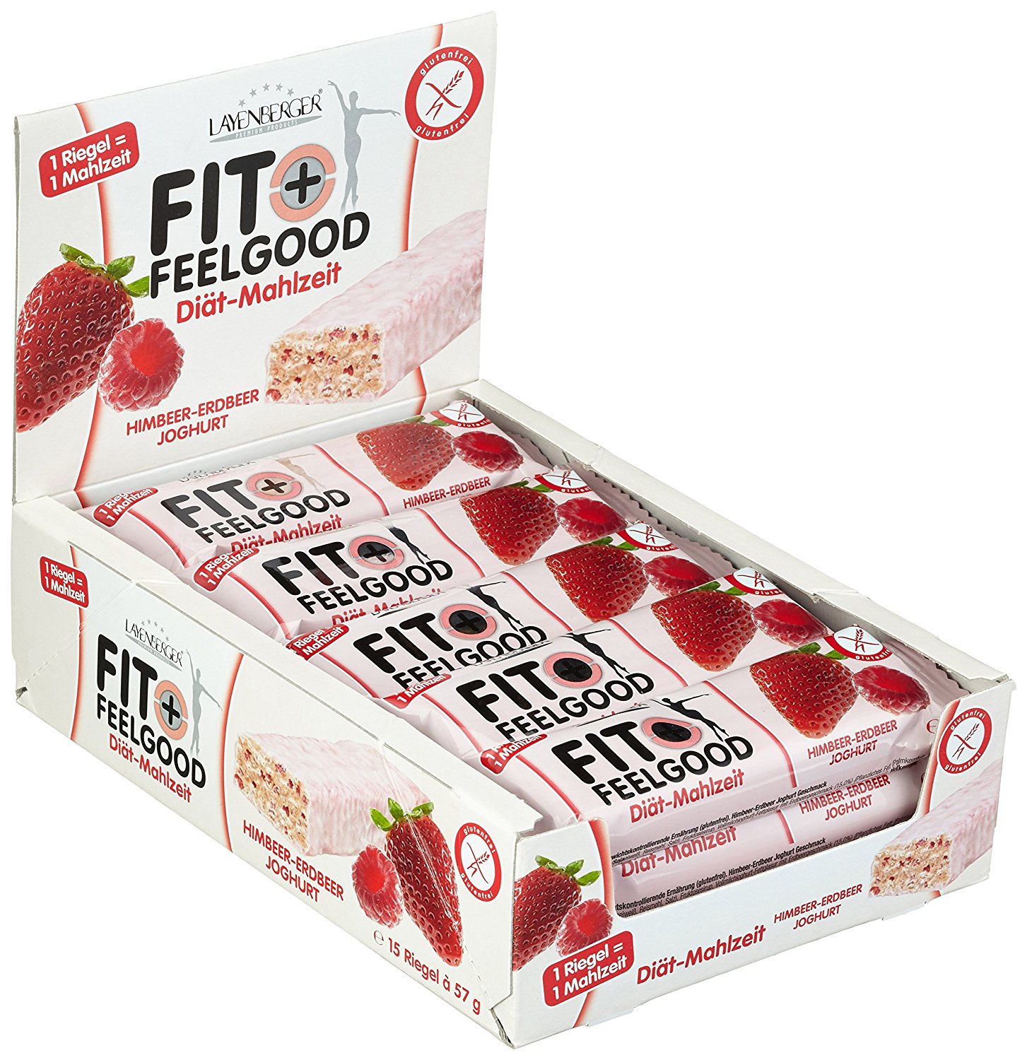 Mit knusprigen Riegeln zur knackigen Figur. Fit+Feelgood können Sie jetzt auch als Diät-Mahlzeit-Riegel genießen. Sie sind knusprig, fruchtig lecker und ersetzen eine vollwertige Mahlzeit. Ob ins Büro, zum Sport oder einfach zu Hause: Die 3 süßen Diät-Mahlzeiten können Sie überall mit hin nehmen und haben so etwas leckeres zum Beißen während der Fit+Feelgood Diät. Ernahrungsphysiologisch ausgewogen, mit hochwertigen Inhaltsstoffen und sogar glutenfrei. Ein Mahlzeitenersatz, der nach Sonne, Mittelmeer und Urlaub schmeckt - einfach unglaublich. LAYENBERGER Fit+Feelgood Diät-Mahlzeit-Riegel sind eben viel mehr als einfach nur Diätriegel. Genießen Sie Ihren Weg zur Wunschfigur!