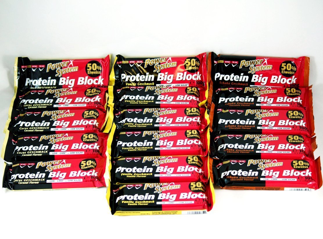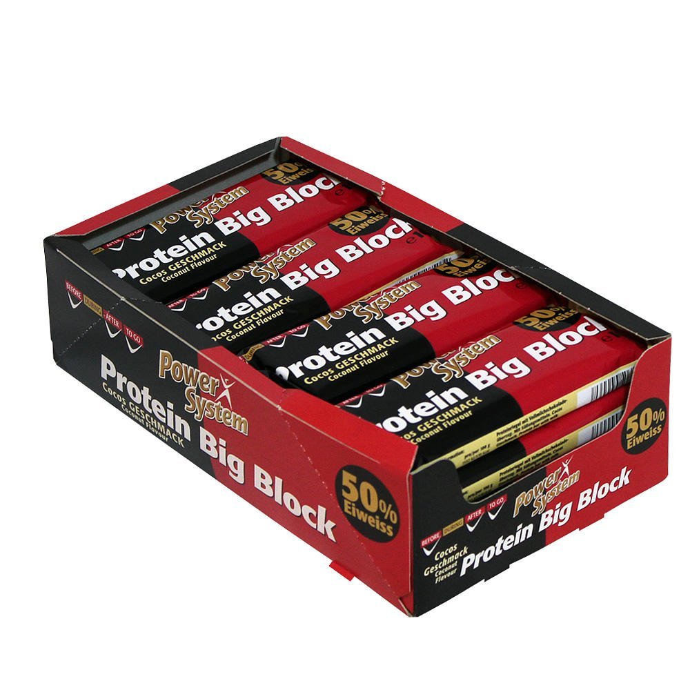 Der Power System Protein BIG Block Riegel (á 100g) besteht zu 50% aus Eiweiß. Ein leckerer Snack mit der extra großen Portion Protein und Vollmilchschokoladeüberzug für zwischendurch. Kann Spuren von Gluten, Erdnüssen und anderen Schalenfrüchten enthalten.