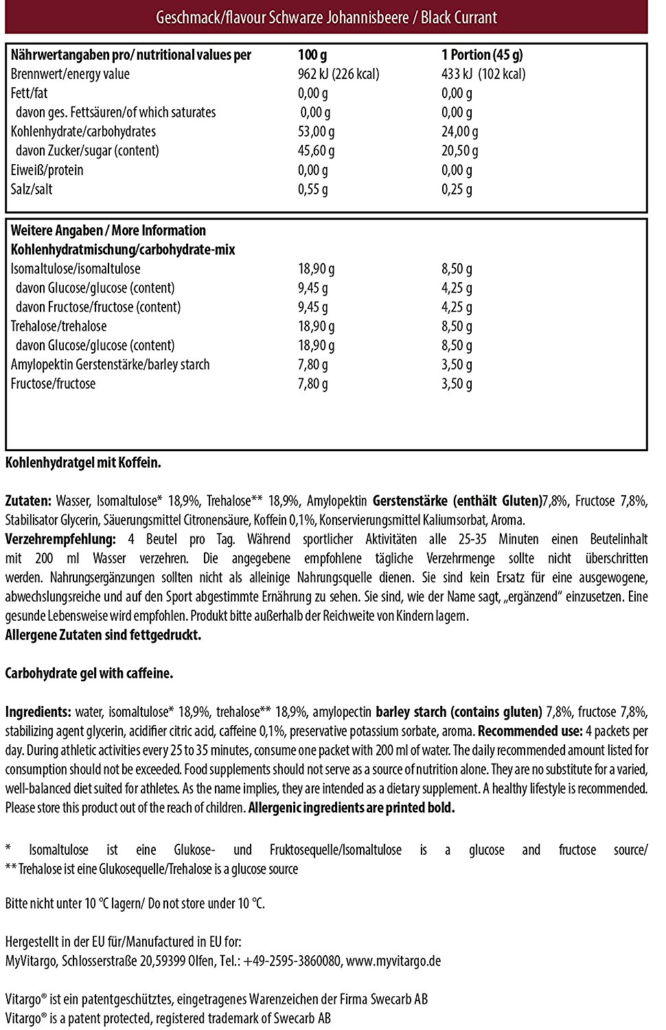 Kohlenhydrate besitzen eine wichtige Rolle als Energielieferant und sollten den Großteil der Nahrung ausmachen, das heißt je nach ausgeübter Sportart und Dauer des Trainings bis zu 50 Prozent und mehr der gesamten täglichen Kalorienzufuhr. Dabei ist das Gehirn sogar auf Kohlenhydrate als einzige Energiequelle angewiesen. Einfache Zucker oder Einfachmolekülstrukturen wie Maltodextrin, Dextrose und/oder Sucrose erhöhen den Blutzuckerspiegel sehr rasch, lassen ihn jedoch, anders als langkettige Zucker, auch sehr rasch wieder abfallen, was nicht wirklich ideal ist, da es ein permanentes Auf und Ab provoziert. Es sollte in Vorbereitung auf körperliche Anstrengungen (Wettkampf oder Training), 2 Tage zuvor begonnen werden, Amylopektin Gerstenstärke einzusetzen. Natürlich kann Vitargo auch während eines Wettkampfs oder danach eingenommen werden um aufgebrauchte Kohlenhydrate wieder zu ersetzen. Außerdem enthält Vitargo Gel noch weitere Inhaltstoffe, die der Zutatenliste zu entnehmen sind. Verzehrempfehlung: 4 Beutel pro Tag während sportlicher Aktivitäten alle 25-35 Minuten einen Beutelinhalt mit 200 ml Wasser verzehren.