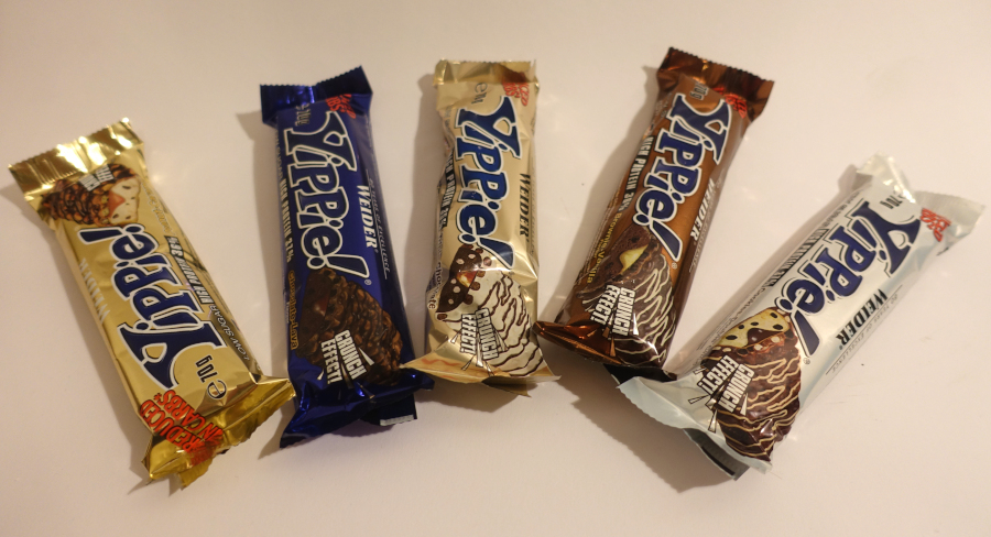 Die neuen Yippie Bar Proteinriegel sind Weiders erste gefüllte Riegel mit sechs verschiedenen Schichten, bestehend aus einer crisphaltigen Eiweißmasse, cremigen Eiweißfüllung, feinen Glasur mit Karamellgeschmack, bestreut mit Crispies bzw. Erdnüssen, Vollmilchschokoladenüberzug und Schokoladendekor.